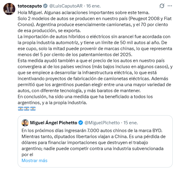 En respuesta, el ministro de Economía Luis Caputo explicó que el esquema fue acordado con las terminales locales. Según el funcionario, el límite anual garantiza que la competencia sea controlada y destacó que solo la mitad de dicho cupo puede provenir de China. Durante 2025, la participación de marcas de ese origen alcanzó un 2,2 por ciento del mercado total.