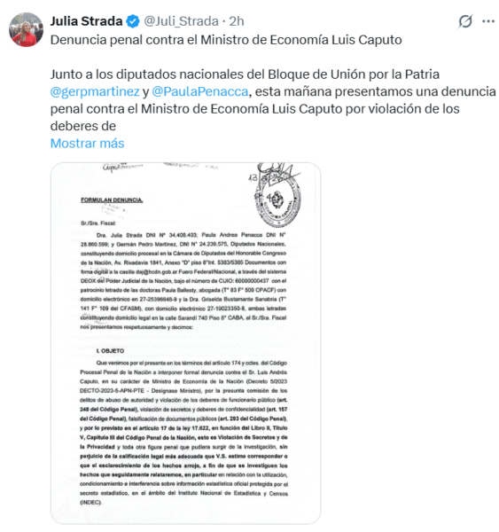 El bloque de diputados nacionales de Unión por la Patria presentó este viernes una denuncia penal contra el ministro de Economía, Luis Caputo.
