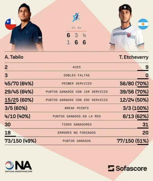 El inicio fue adverso, ya que Tabilo, 71° del ranking, dominó el primer set con dos quiebres y sin conceder oportunidades, por lo que cerró 6-1 en 36 minutos. Sin embargo, el argentino reaccionó en el segundo parcial: tomó ventaja rápida, volvió a quebrar tras el descuento del chileno y selló el 6-3 con mayor solidez.
