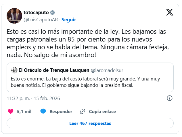 Luis Caputo criticó la indiferencia empresarial ante la reforma laboral, que reduce las cargas patronales del 27% al 15% para nuevos empleos. El ministro lamentó que, pese al fuerte alivio fiscal, las cámaras mantengan cautela mientras la CGT evalúa protestas.